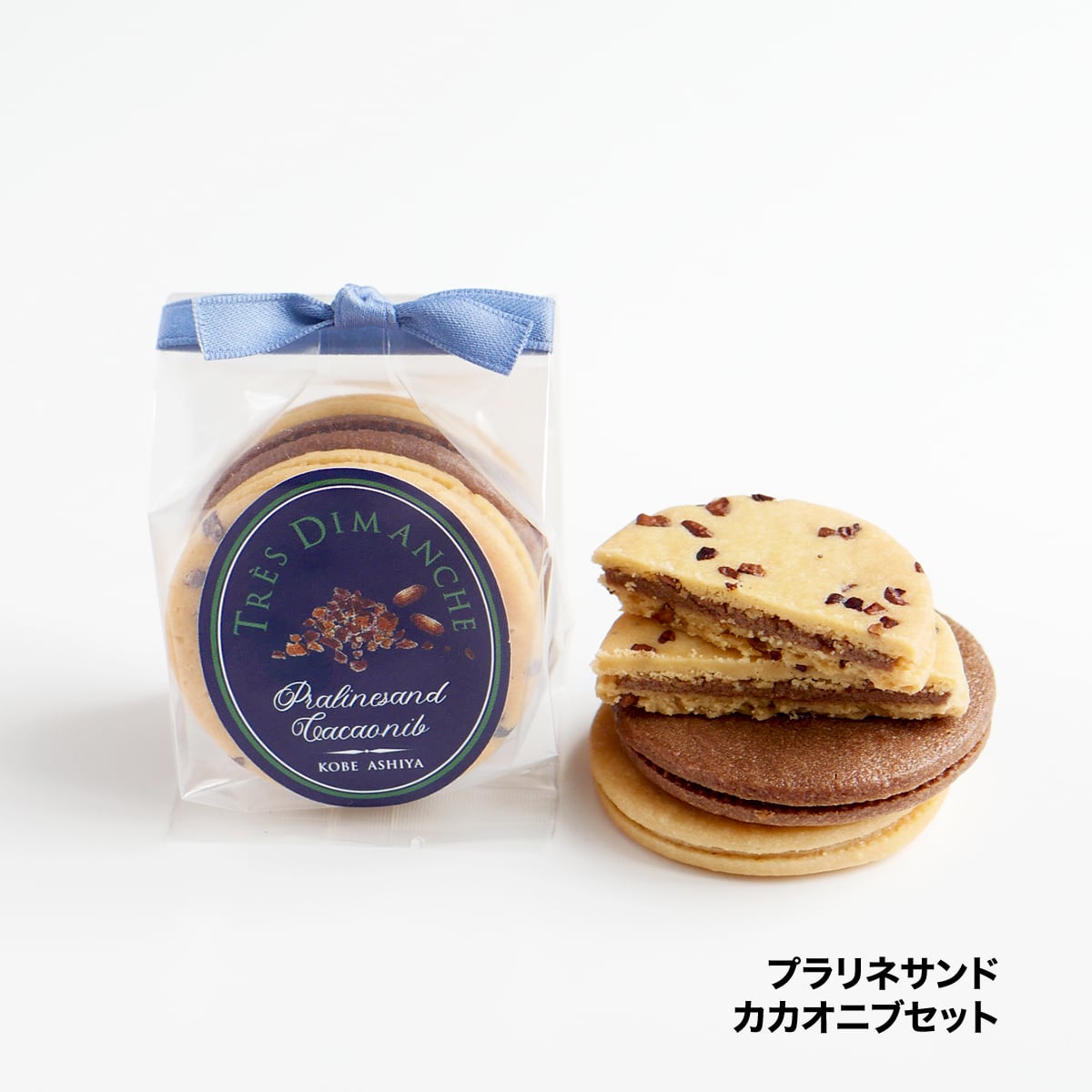 北海道産バターと小麦を使用した、サクサク軽く香ばしいサブレに、自家製のヘーゼルナッツ&アーモンドのプラリネとチョコレートを合わせたクリームをサンド。